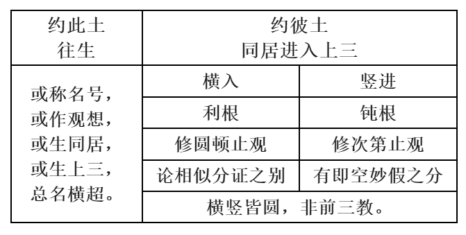 “若约此土往生,或称名号,或作观想,或生同居,或生上三,总名横超。若约彼土,同居进入上三,则有横有竖,根性不等故。若利根则横入,钝根则竖进。横入,则修圆顿止观,则论相似分证之别。竖进,则修次第止观,则有即空妙假之分。虽分横竖,横竖皆圆,非前三教。”