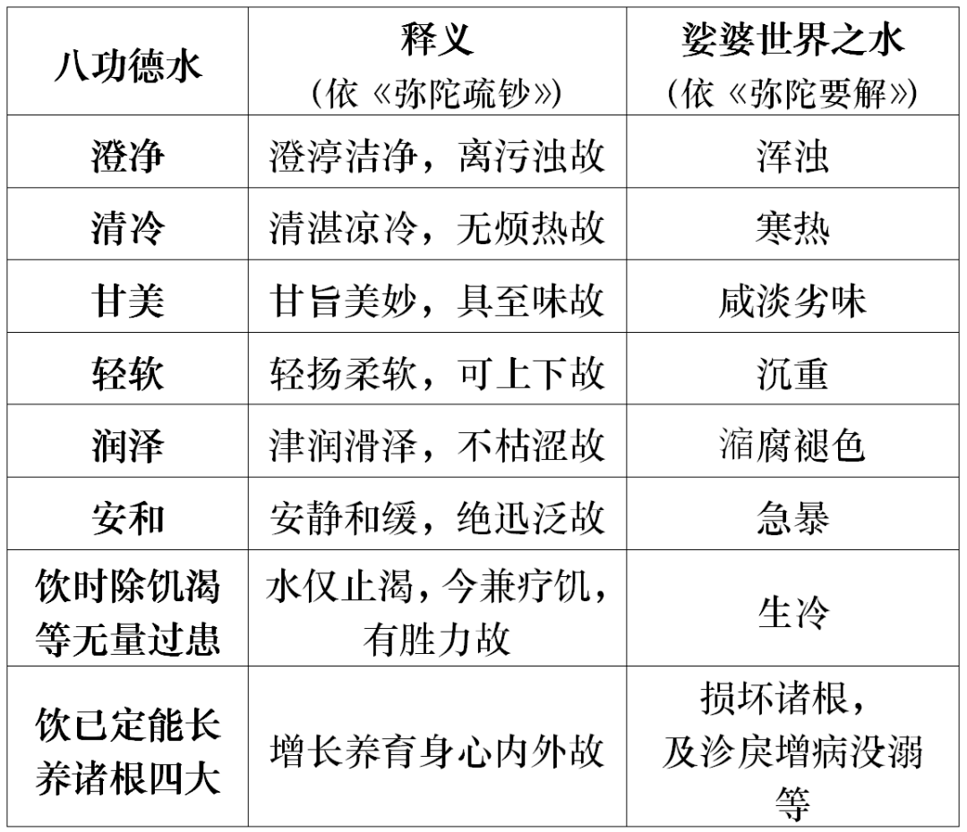 “八功德者:一、澄清,异此方浑浊;二、清冷,异寒热;三、甘美,异咸淡劣味;四、轻软,异沉重;五、润泽,异㴼腐褪色;六、安和,异急暴;七、除饥渴,异生冷;八、长养诸根,异损坏诸根,及沴戾增病没溺等也。”