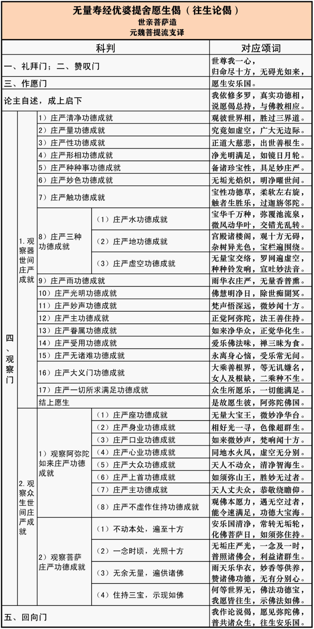 主要是观察门里面特别细,观察门里面二十九种科判都做一个图表。所以最好你背《往生论偈颂》四百八十个字,记忆力好的人两个小时就背下来了;记忆力差的人,两天肯定也能背下来。背下来之后,偈颂懂了之后,你随时随地可以边念边随文入观,边思维它的道理,这实际上就是念佛,就是观修。
